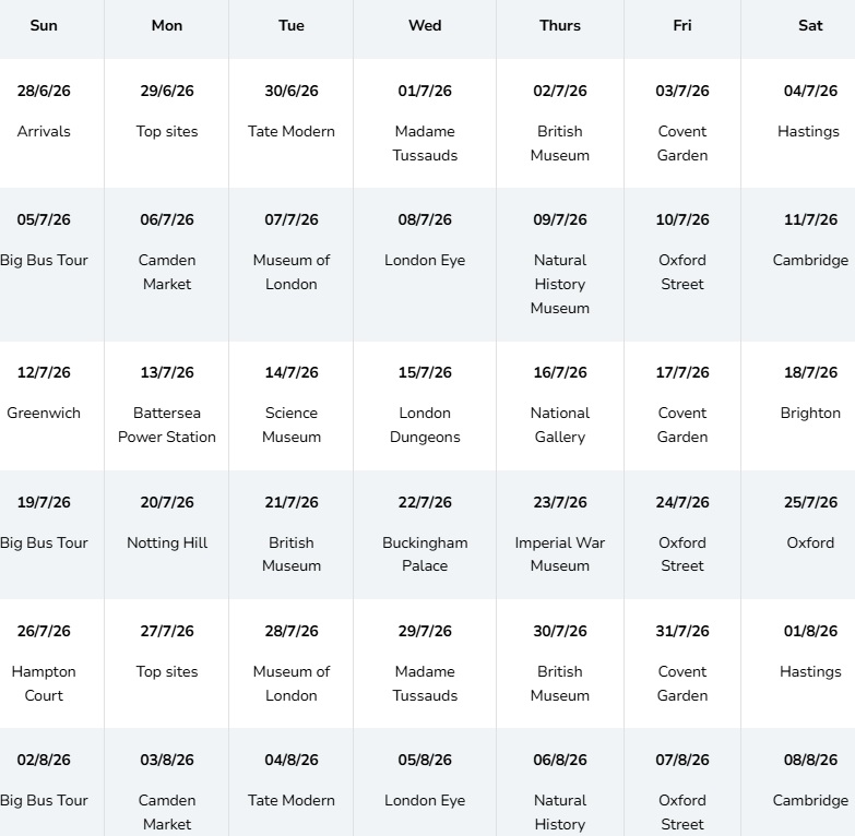 Starannie zaplanowany pobyt obejmuje wizyty w znanych miejscach, takich jak londyńskie lochy, pałac Buckingham, rejs po Tamizie oraz zakupy w Covent Gardens, Harrods i Oxford Street. Będziesz miał okazję zwiedzić urocze rynki, takie jak Borough Market i Notting Hill, a także wybrać się na wycieczkę do muzeów, takich jak Muzeum Historii Naturalnej, Muzeum Nauki, Tate Modern i Galeria Narodowa.