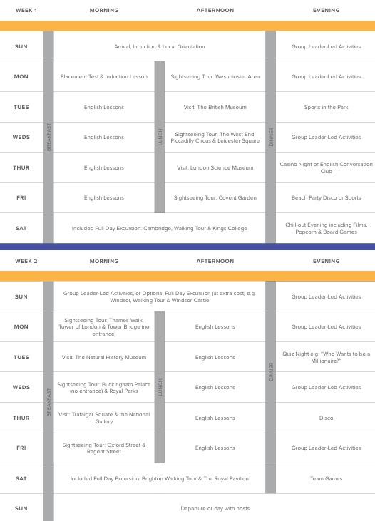 Inny program zajęć dla kursów Bloomberg Business Advantage a w nim półdniowe wycieczki mające na celu aspekty edukacyjne i kulturalne, które będą poszerzać i inspirować program akademicki, a także zapoznają uczestników z atrakcjami jednego z z największych miast na świecie. Wieczorne zajęcia są towarzyskie i zabawne – najważniejsze atrakcje; musical West End, dyskoteka i warsztaty komediowe. Wycieczki weekendowe są stymulujące, sobota jest mieszanką eksploracji i nauki, niedziela jest bardziej relaksująca.