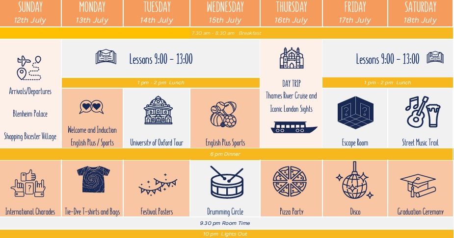 Całodniowe wycieczki do Londynu, Stratford Upon Avon i Bath. Półdniowe wycieczki obejmują lokalne muzea, rejs po rzece i wizyty w Oxford University College. Organizowany jest pełny i urozmaicony program zajęć popołudniowych i wieczornych, który będzie obejmował wybór sportów, a także inne zajęcia, takie jak wieczory filmowe, pokazy talentów, noc karaoke, dyskoteki studenckie i quizy