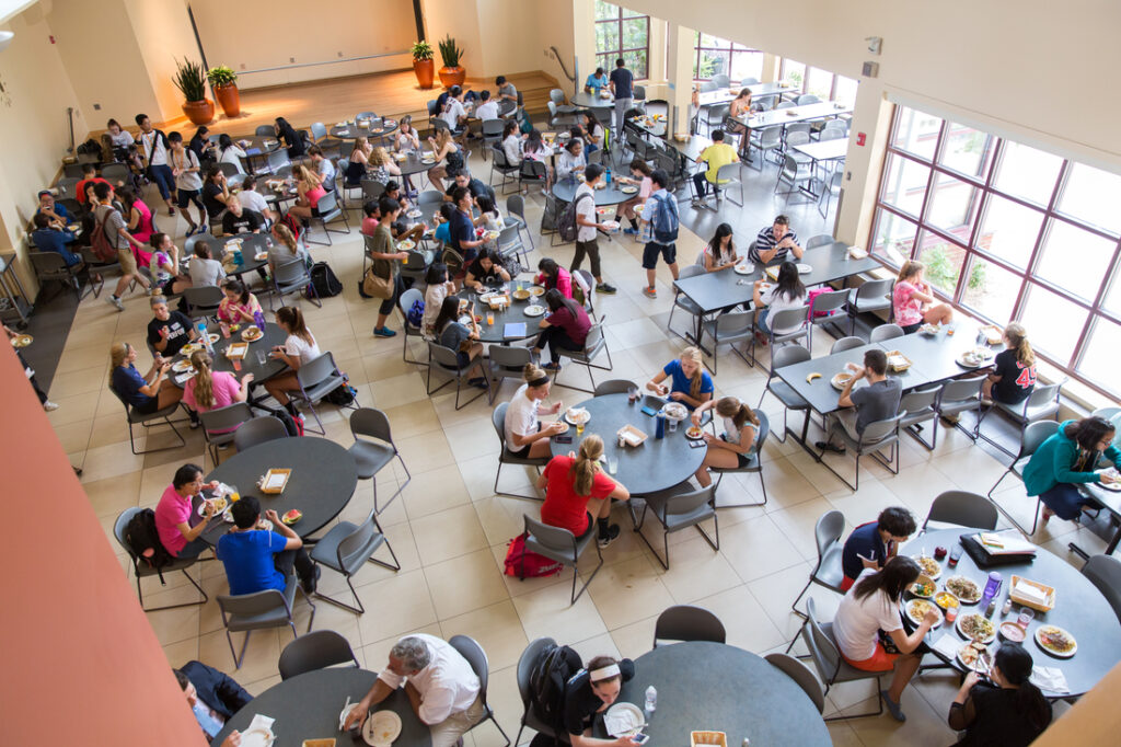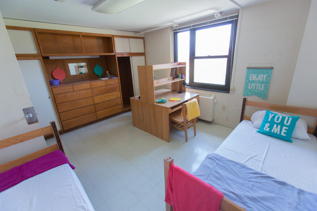 Tradycyjny układ akademika w USA. Pralnia dostępna w każdym budynku rezydencji za niewielką opłatą. Pomieszczenia ogólnodostępne i łazienki sprzątane są codziennie. Wi-Fi w całym kampusie