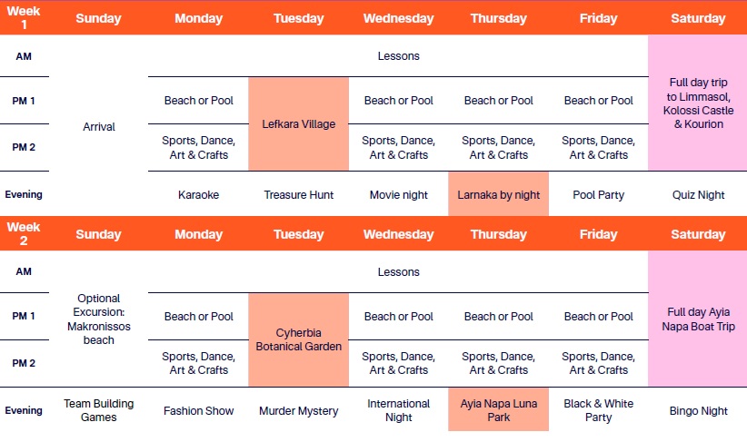 Szkoła organizuje w każdym tygodniu 2 wycieczki półdniowe i 1 całodniową oraz liczne zajęcia po południami i wieczorami. Wszystkie dodatkowe atrakcje prowadzone przez entuzjastyczny i przyjazny personel i są zaprojektowane tak, aby były częścią nauki języka na zajęciach w klasach.