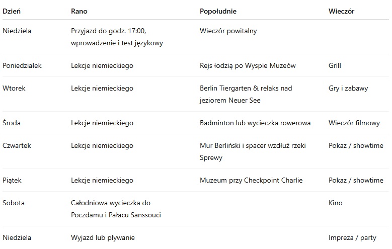 Bardzo szeroki program zajęć pozalekcyjnych w którym znajdziesz wszystko, co jest potrzebne abyś mile spędził czas z nowymi znajomymi z rożnych krajów. Wyjątkowa lokalizacja zapewnia szeroką gamę zajęć na świeżym powietrzu oraz możliwość zwiedzenia stolicy Niemiec. Wszystkie zajęcia w grupach międzynarodowych pod okiem doświadczonych opiekunów, zaplanowano: