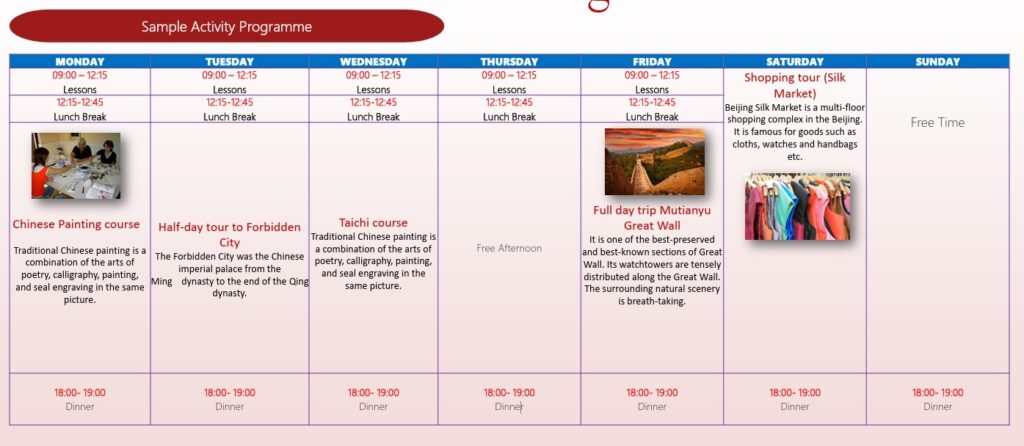 Spójrzcie na przykładowy plan zajęć, aby lepiej wyobrazić sobie, jak może wyglądać typowy tydzień w Pekinie i jakie atrakcje czekają na Was podczas pobytu.